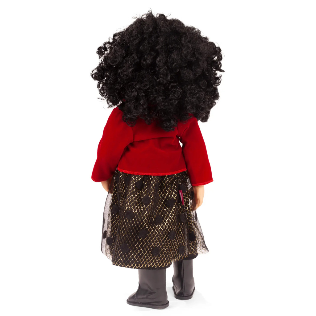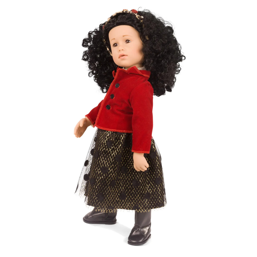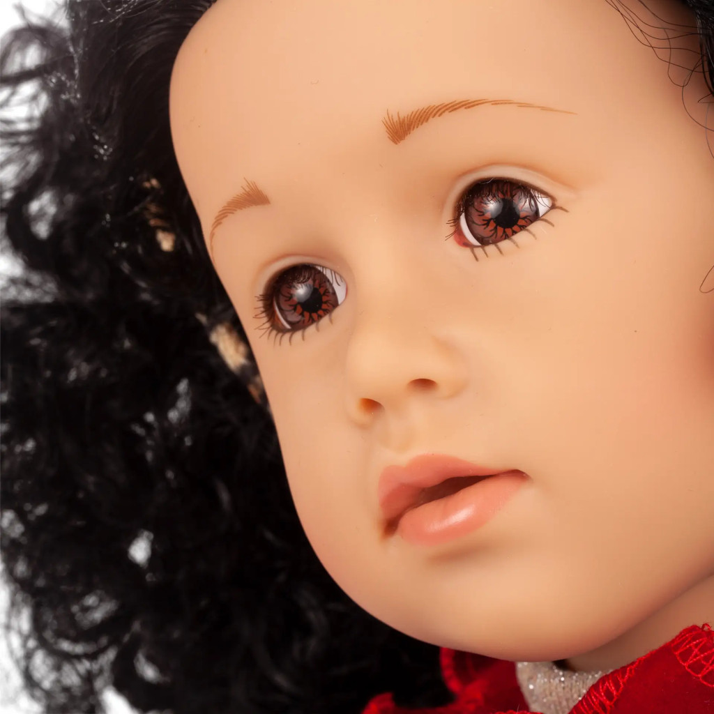 Charlotte, ekskluzywna edycja świąteczna, zachwyca jakością i wyjątkową dbałością o szczegóły. Ma czarne loki i świąteczny strój składający się z czerwonej aksamitnej marynarki, tiulowej spódnicy i błyszczącego topu, uzupełniony opaską w panterkę ozdobioną błyszczącymi kamieniami. Ta limitowana edycja łączy w sobie stylową elegancję, ruchome stawy i kunszt wykonania – to wyjątkowy prezent, który w niezwykły sposób oddaje magię świąt i może stać się towarzyszem na całe życie.