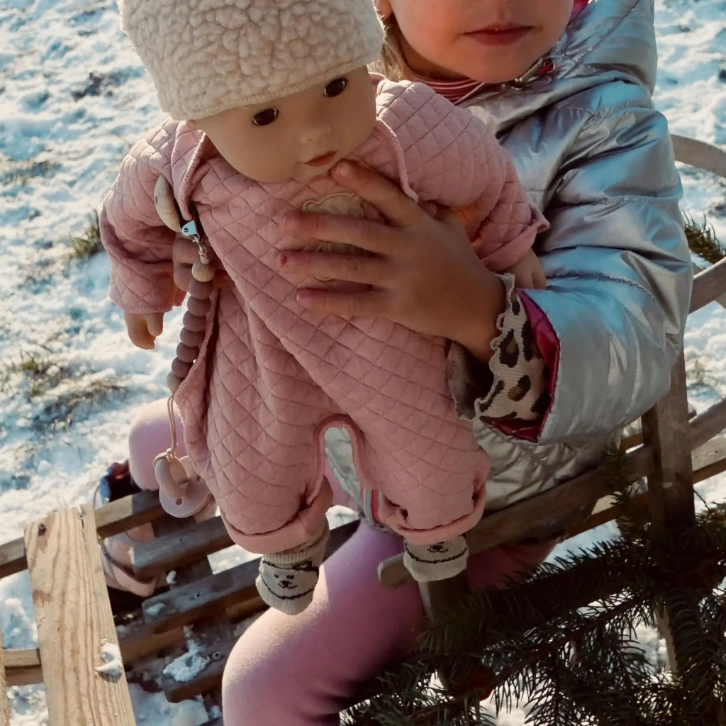 Păpușa bebeluș Maxy Muffin combină designul atent gândit cu calitatea înaltă. Poartă o salopetă matlasată cu o aplicație delicată de ursuleț de pluș, completată de o căciulă moale de pluș și șosete asortate. O suzetă cu lanț completează ansamblul elegant. Cu designul său armonios, această păpușă invită la joacă, transmițând în același timp o valoare durabilă - un companion care oferă atât bucurie, cât și confort.